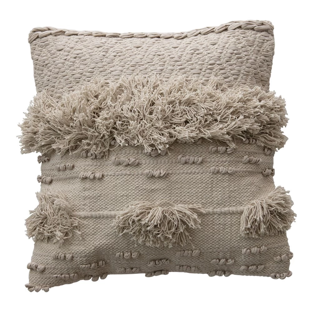 20″ Square Cotton Textured Pillow with Fringe, Cream Color