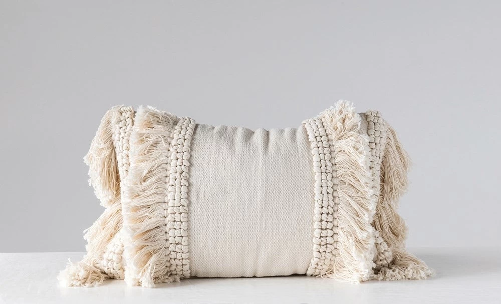 24″L x 16″H Cotton & Chenille Woven Lumbar Pillow w/ Fringe, Cream Color