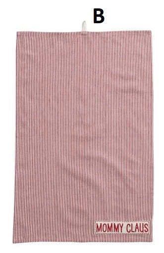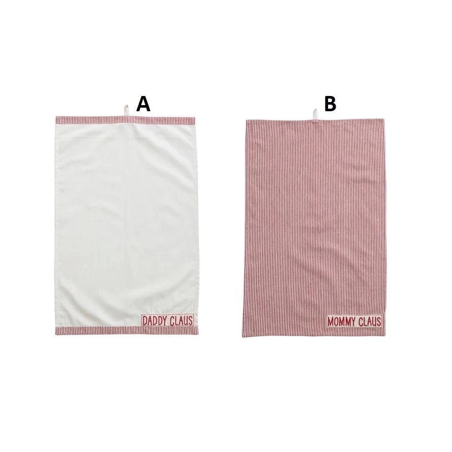 “Mommy Claus / Daddy Claus” Embroidery & Stripes Kitchen Towel, White & Red, 2 Style Options