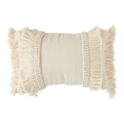 Chenille Woven Lumbar Pillow With Fringe, Cream, 24”
