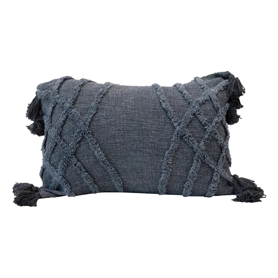 Stonewashed Cotton Blend Slub Pillow With Tufted Pattern & Tassels, Blue