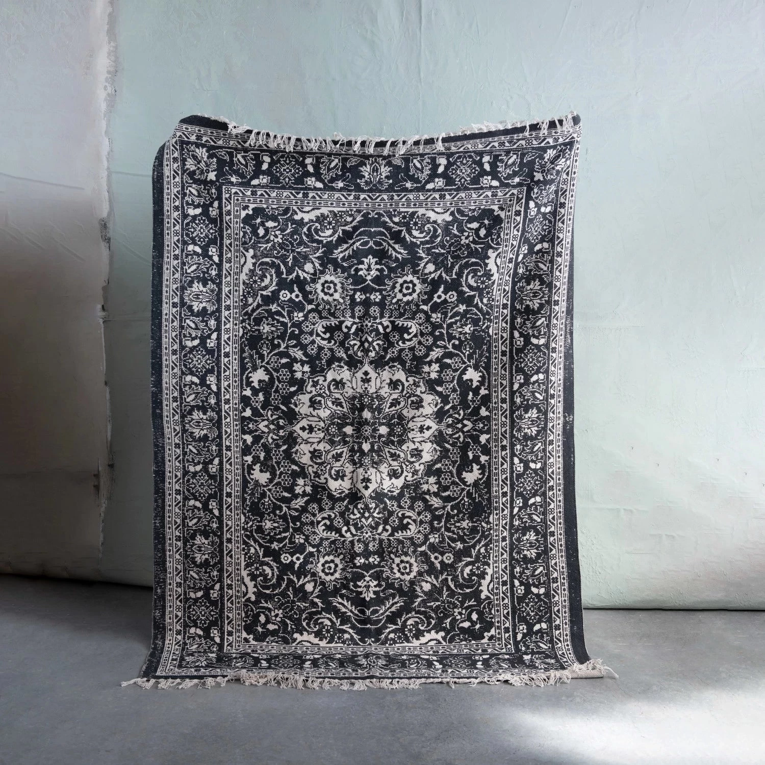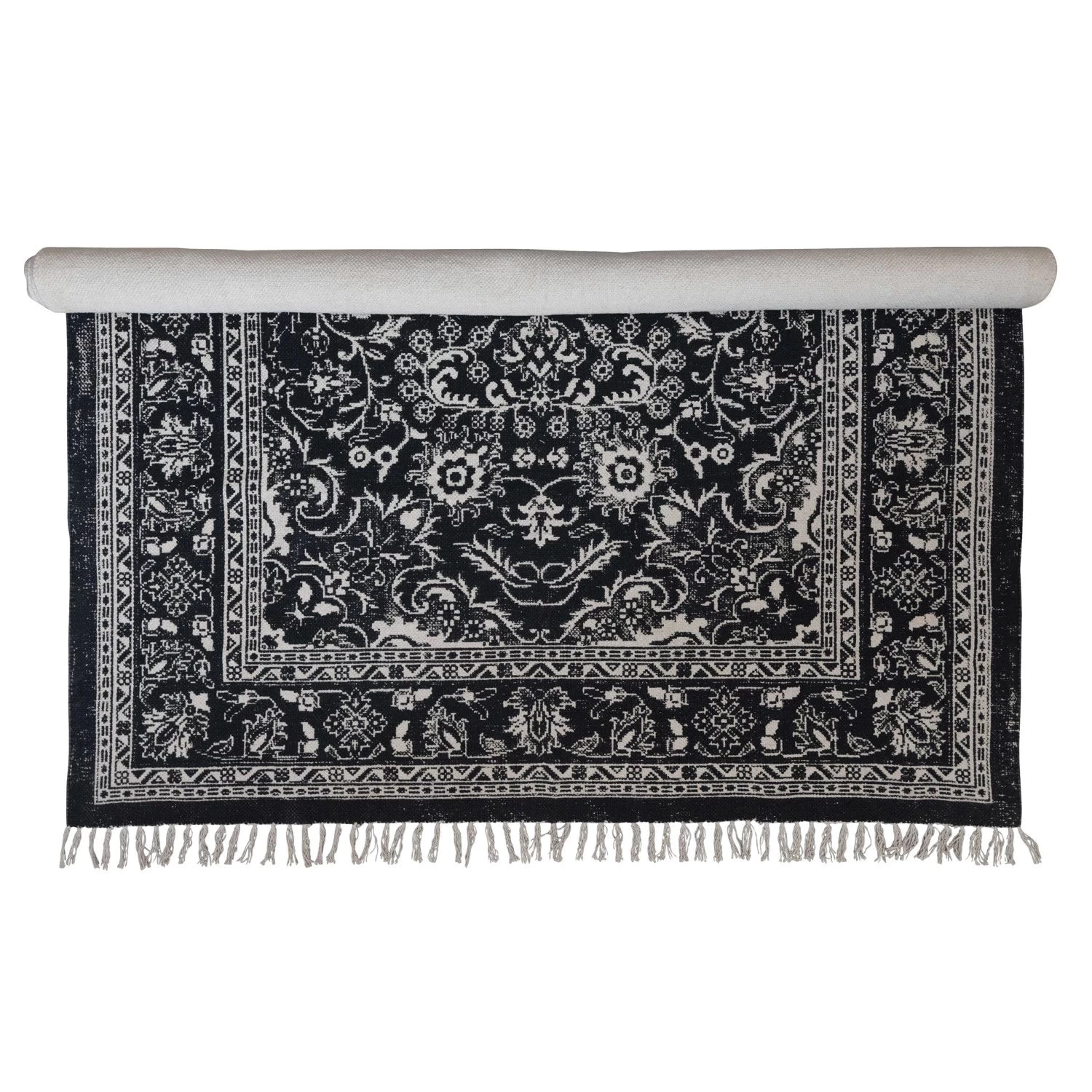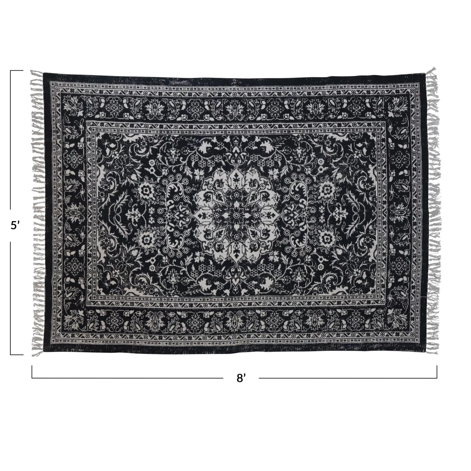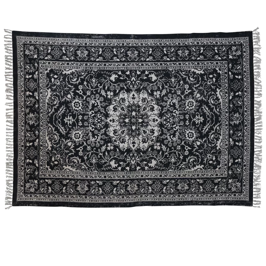 Woven Cotton Distressed Print Dhurrie Rug With Fringe, Black & White (Pick Up Only)