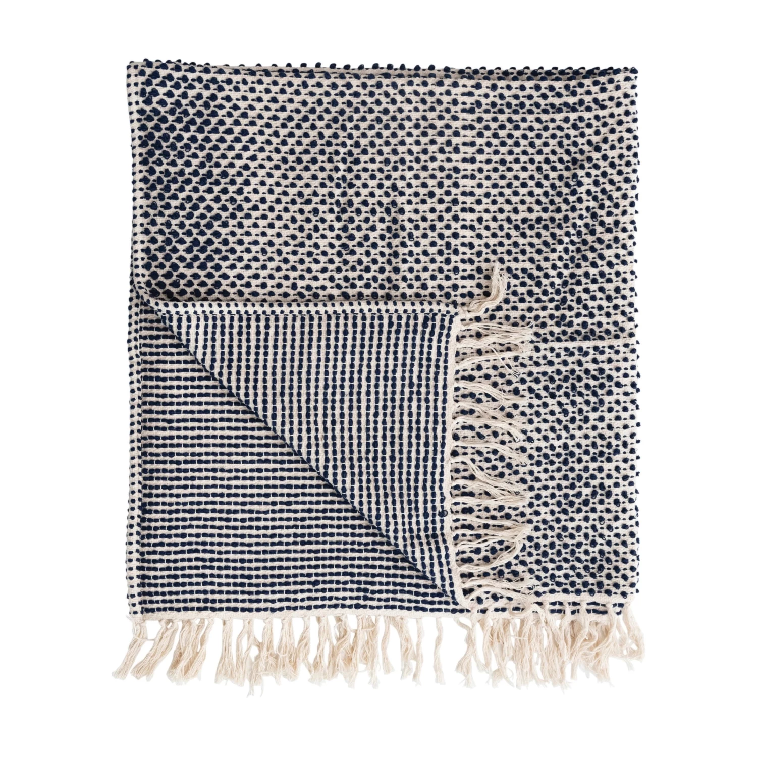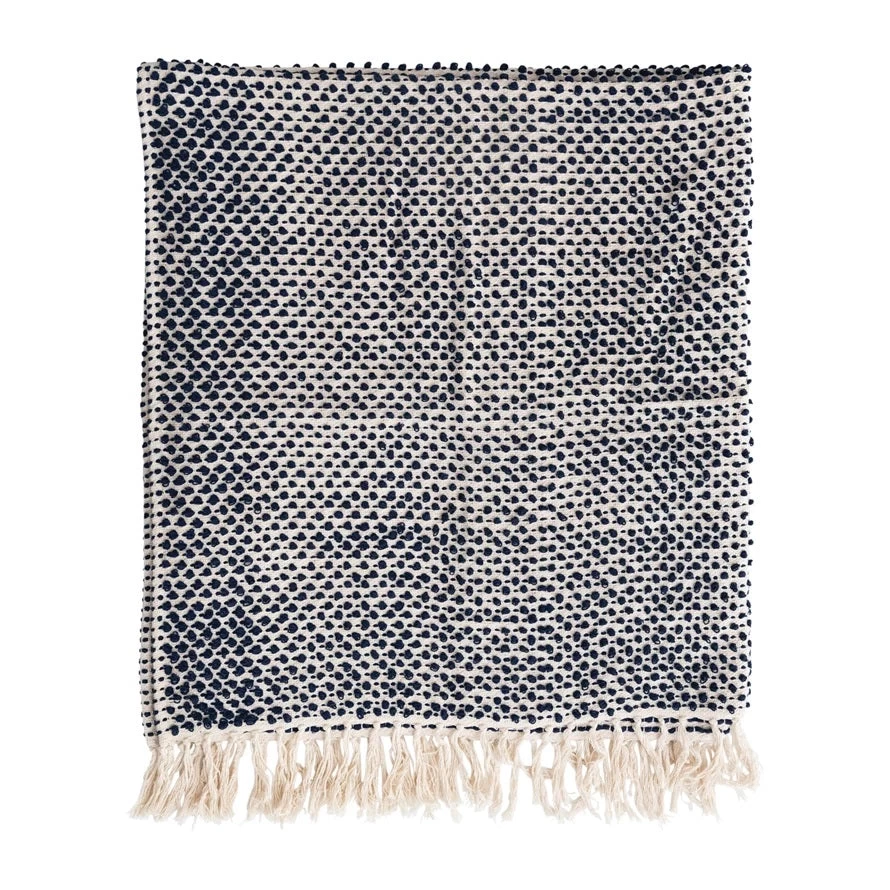 Woven Cotton Throw With Fringe, Navy & Cream Color